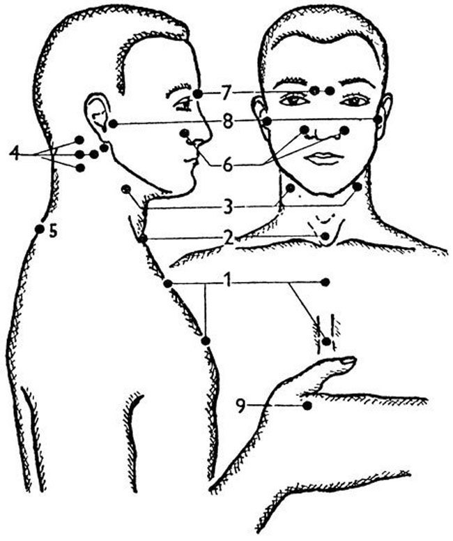 6. Точечный массаж очень хорошо помогает при первых симптомах болезни. Ниже приводим схему. Воздействуем большими или указательными пальцами на биологически активные точки против часовой стрелки до 21 раза, для лучшего эффекта можно утром и вечером.